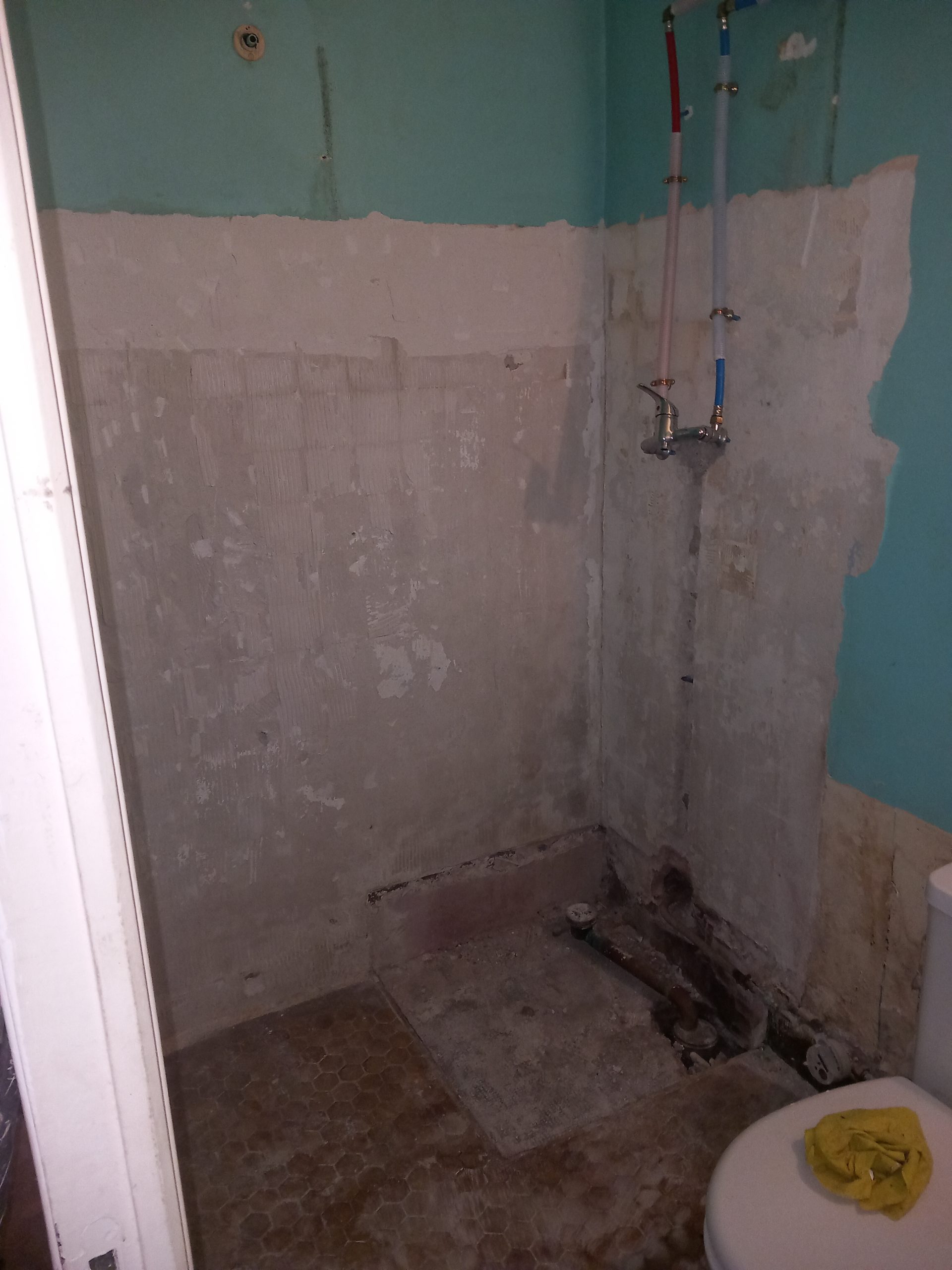 • rénovation d’une salle de bain (remplacement de la douche, refaire les évacuations d’eau et les arrivées, placo carrelage)